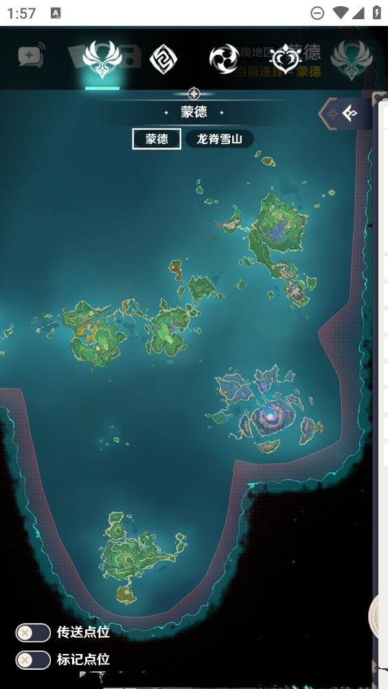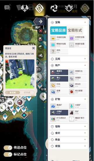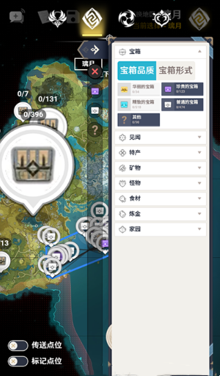 3.提供风神瞳、岩石神瞳、宝箱、野外boss、七天神像、NPC、传送点、地窟、矿藏、秘境等资源点的详细分布位置。