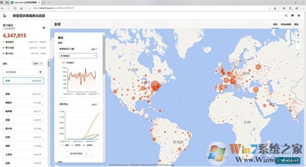 值得一提的是,Win10的这份疫情报告整体设计可圈可点。采用数据+地图的展示方式。数据点的大小直接代表了确诊病例的数量,非常直观。默认显示当前用户所在国家。当然,您也可以手动选择其他国家的数据。