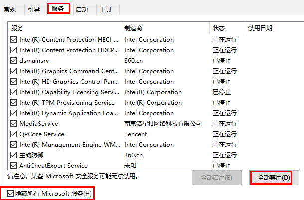 用“win”+“r”调出“运行”,然后输入“msconfig”,再勾选“服务”中的“隐藏所有微软服务”,最后点击“全部禁用”。