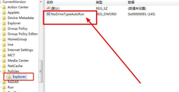4、双击Explorer文件夹,找到右侧的NoViewContexMenu,用删除键删除,然后重新启动电脑。