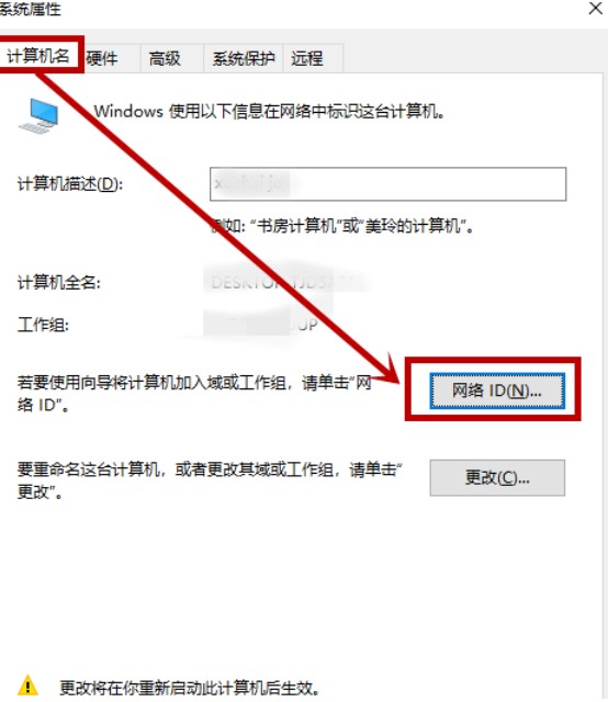 1. 打开系统属性并单击网络ID。