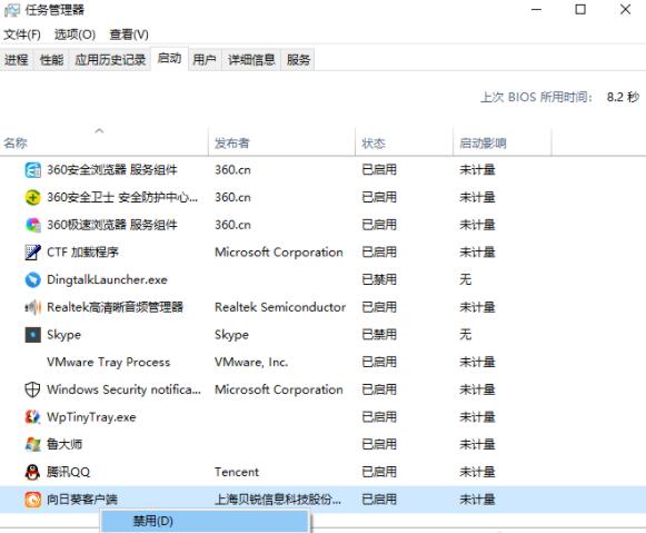 3. 选择需要关闭自启动的软件,单击“禁用”。