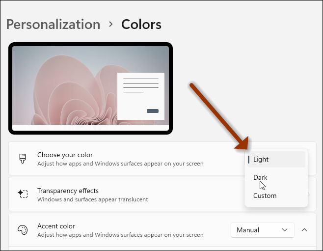 3. 打开“选择颜色”中的下拉菜单,然后根据需要选择浅色或深色。