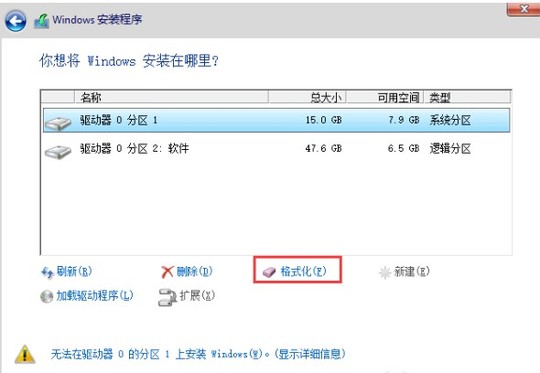 第五步:格式化你的安装分区,比如C盘(如果你的磁盘没有分区,按照提示操作,安装过程中会自动分区);