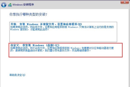 第四步:接下来,选择自定义安装。升级安装无法安装。