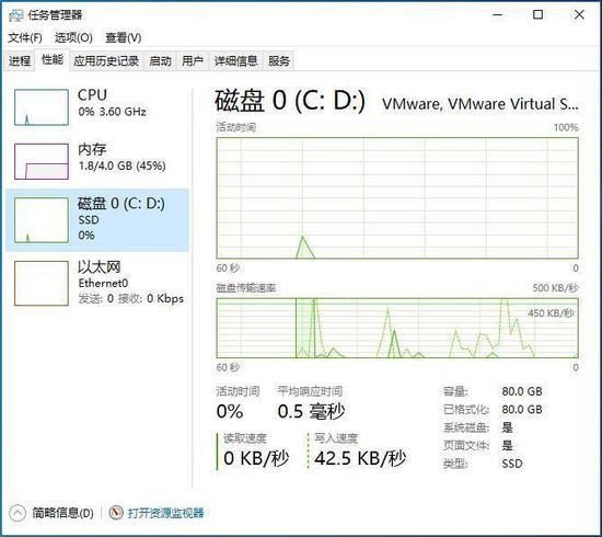 切换到Win10任务管理器中的性能选项卡,可以看到磁盘类型是SSD固态硬盘还是HDD机械硬盘。
