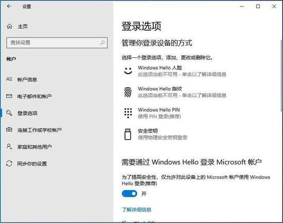 Win10的设置-帐户-登录选项设置界面新增了通过Windows Hello登录微软帐户的选项,建议开启。