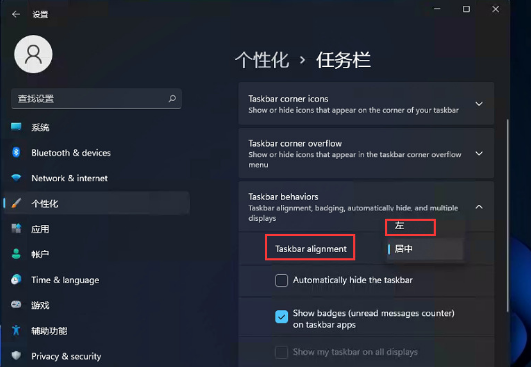 4.在任务栏行为选项中,可以看到任务栏对齐设置,然后选择左对齐。