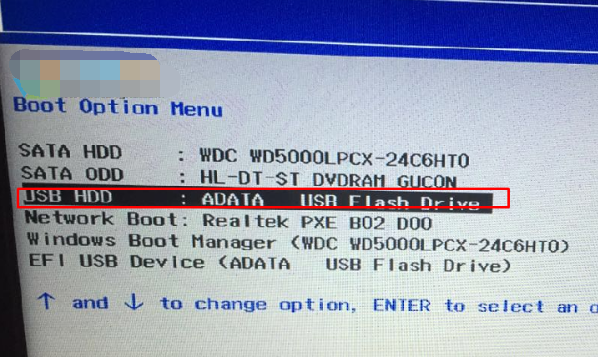 1。重启后,我们可以通过按FN+F12来启动设备选项界面~选择你的u盘启动盘(从USB HDD开始),回车;