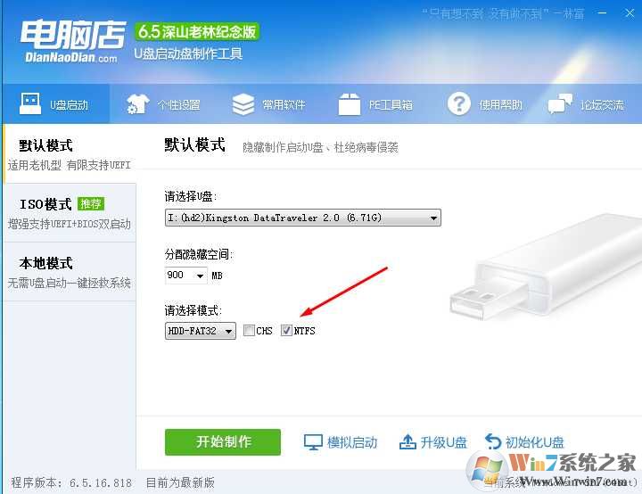 重新制作U盘启动盘,以电脑商店U盘启动盘制作工具为例,制作时勾选NTFS格式。如下所示;