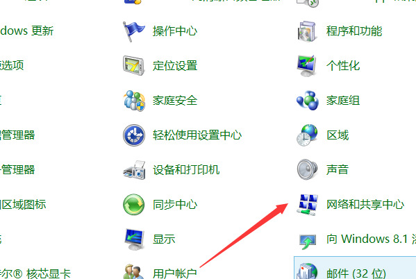 2.在打开的控制面板界面中,点击【网络和共享中心】按钮;