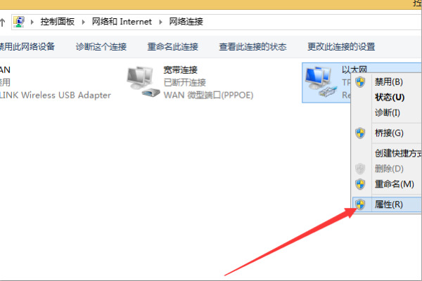 4.在弹出的页面中选择当前网络连接图标,右键选择【属性】按钮;