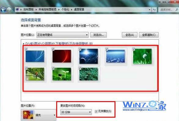 3.然后在桌面后台界面,勾选你准备好的喜欢的图片,然后在“更改图片时间间隔”中设置你想要自动切换的频率,然后点击保存修改按钮即可完成。