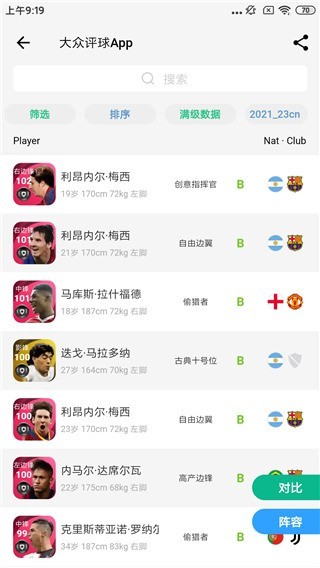 1.比较实时足球运动员能力值、实时足球运动员收藏夹功能