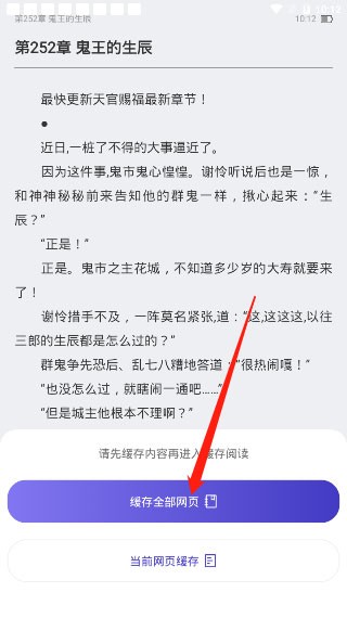4.现在我们来到小说阅读界面。首先点击手机屏幕中央,然后我们点击右上角的“下载”图标。