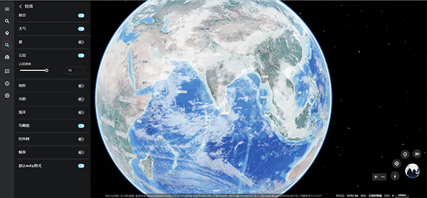 支持星空、大气、雾、灯光、海洋、云彩、地形等多种数字地球特效设置。