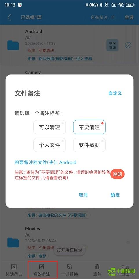 (所有页面的文件都可以进行备注,但“存储文件分析”页面是针对根目录下的文件夹,所以建议先在“存储文件分析”页面进行评论。所有评论都可以在首页的“备注文件”页面进行管理。例如:照片、录音、视频、音乐、游戏资料、工作或学习资料等目录,只要不想清理,都可以评论为“不清理”以防止意外删除)