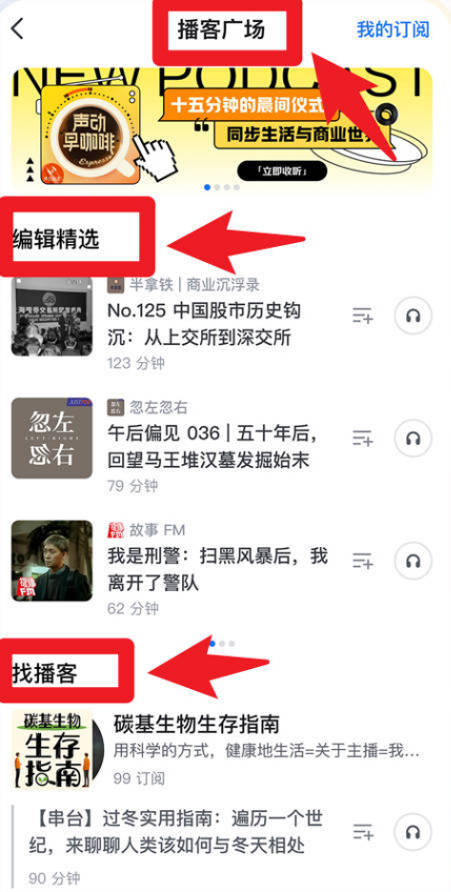 3、在播客广场,用户可以查看编辑精选的内容,并通过播客搜索功能订阅和收听更多优质音频节目,丰富日常学习和娱乐。