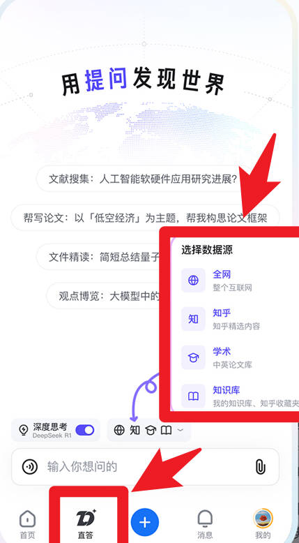 2、在直接解答界面,用户可以选择全网、知乎、学术、知识库等不同数据源进行提问,快速获得全面准确的答案。