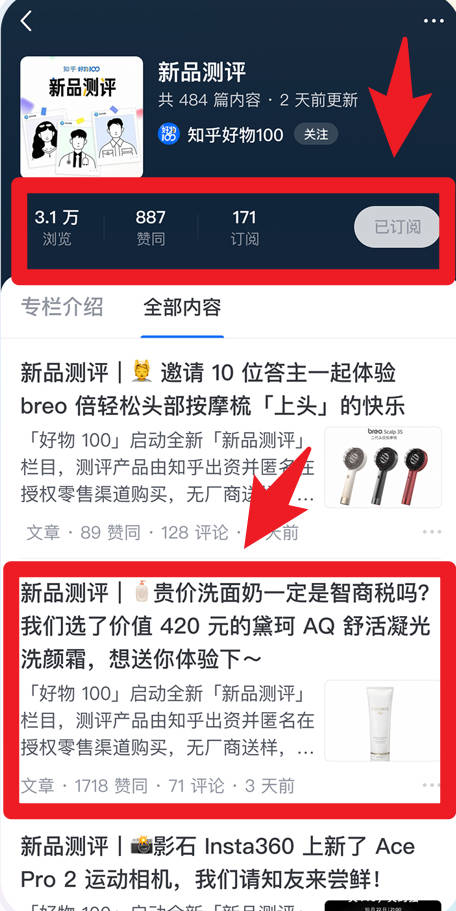 4、在栏目订阅详情页面,用户可以查看浏览量、点赞数和订阅数,阅读特定文章,及时了解产品评论及相关深度内容。