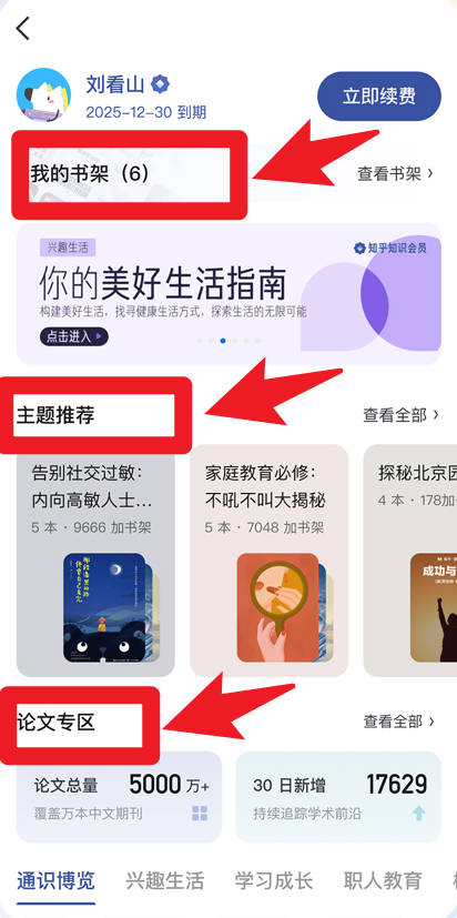 5、在个人主页,用户可以进入我的书架,查看主题推荐和论文区,系统会根据兴趣推荐合适的书籍和学术资料,提升学习体验。