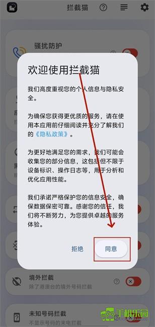 1.下载安装并打开拦截猫app,点击同意