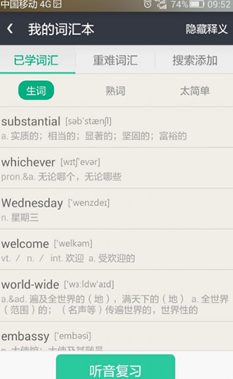 8.主页面底部有听力复习,难词,学习统计功能。