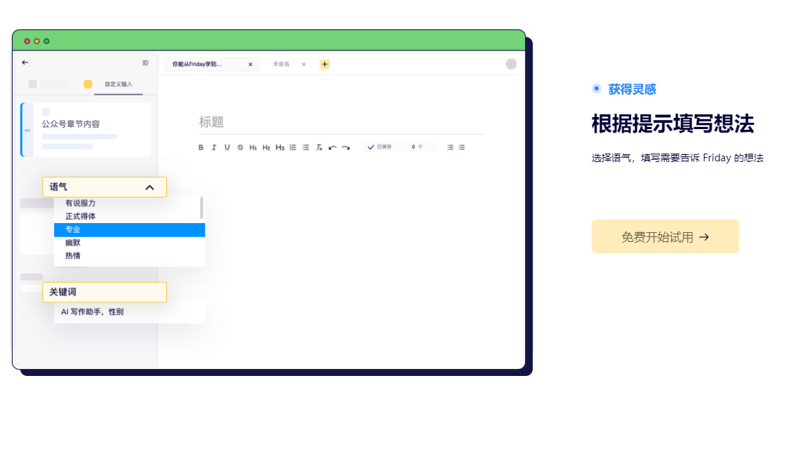 heyfriday智能ai写作工具ios版是一款基于人工智能技术的写作工具,可以帮助用户快速生成文章、博客、新闻稿、产品描述等高质量的文本内容。智能人工智能写作系统,让您轻松生成优质原创文章。它可以快速生成稿件,帮助SEO优化,给你启发。它可以帮助用户生成各种类型的内容,包括新闻报道、产品描述、博客文章等。用户只需提供相关信息,即可帮助用户快速生成高质量的文章和内容,提高写作效率和质量。