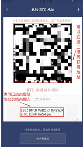 2、收币是指将别人账户上的钱转到自己账户上。以BTC发币为例,点击BTC进入如上页面。第一步:点击“收币”,即可看到二维码和地址,您可以将二维码发送给他人扫描获取转账地址,也可以直接点击复制地址并发送给他人。