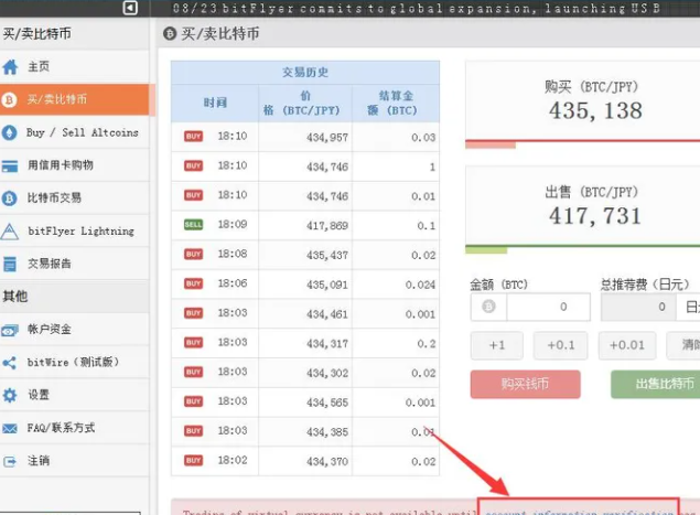将根据输入的金额显示JPY 和BTC 的总和。选择确认订单。