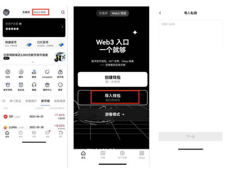 首先,将钱包私钥或助记词导入到欧易链上的钱包中:打开欧易APP,点击中间图标选择【Web3钱包】-【导入钱包】,按要求完成导入。