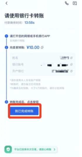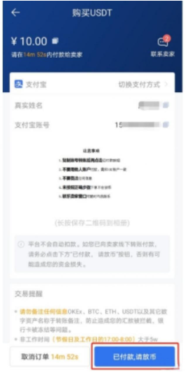 1:付款后,您需要点击页面上的【我已完成转账】按钮,对方才能给您放币。