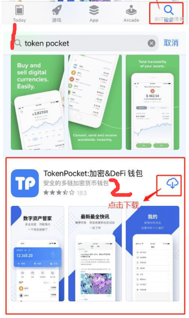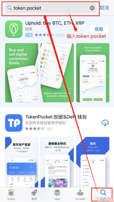 然后退出“APP Store”重新进入,切换页面到美国区,选择右下角“搜索”,进入搜索页面,在搜索框中输入“tokenpocket”,就会出现TP钱包在页面上,点击下载。