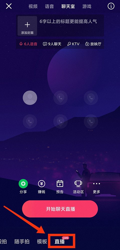 4、然后点击正下方的【+】按钮,滑动到右侧的【直播】部分即可开始直播。