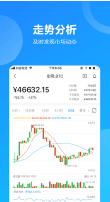 1、实时行情:查看国内外主要交易市场的比特币/莱特币/狗狗币实时价格,查看各市场最新K线图和市场深度图。 K线支持时间段显示和缩放;