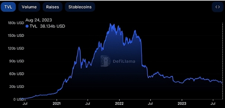 此外,本月DeFi TVL 的锁仓量也持续下降,触及2021 年2 月以来的最低点,目前约为381.34 亿美元。与2021 年Defi Summer 期间超过1700 亿美元的峰值相比,下降了70% 以上。