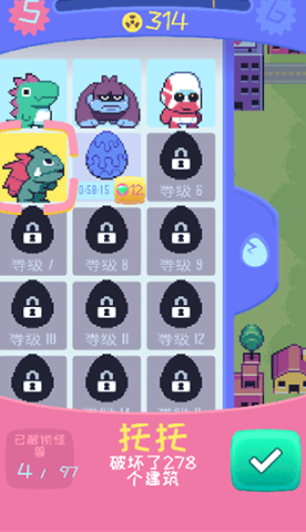 6.怪物蛋孵化后,会出现不同形状的怪物。不同的能力有不同的摧毁建筑物的方式。众多怪物等你收集;