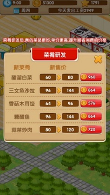 玩家还需要在游戏中开发各种美味佳肴,比如酸白菜、三文鱼沙拉、蘑菇木耳饺子、糖醋鱼、蒜苗炒肉等等,同时还需要定制合理的价格对于这些菜肴。