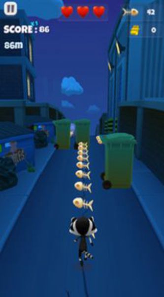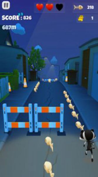 1.玩家通过触摸手机屏幕控制猫的奔跑、跳跃、躲闪等动作,同时收集金币并使用道具。