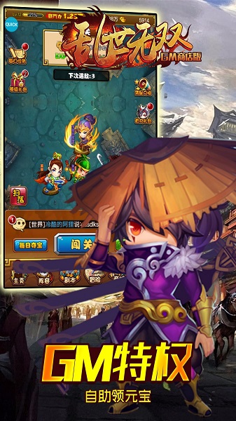 乱世无双gm商店版超多福利震撼上线,GM特权、高级VIP、海量金币等你来领取,超多三国武将、地下城打怪、轻松一键完成,半挂模式,有趣的社交体验模型,快来下载吧!