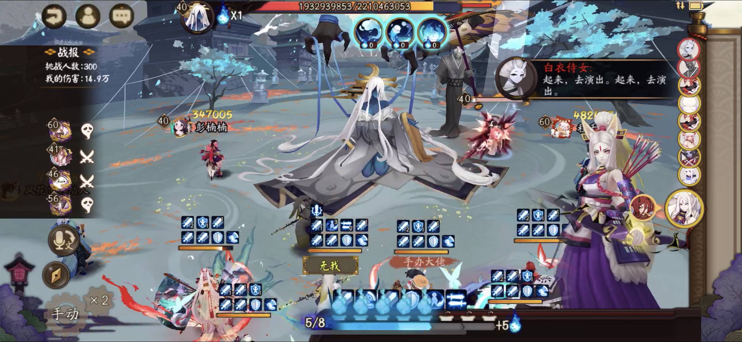 第三阶段,先杀持伞人,再杀鬼歌者。此时开启自动控制,吞酒,花鸟卷一般攻击,其余神选择魔法,比手动控制更省时间,输出效率更高。