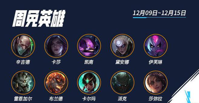 本次限免的时间为12月09日-12月15日,辛吉德、卡莎、凯南、黛安娜、伊芙琳、雷恩加尔、布兰德、卡尔玛、派克、莎弥拉等英雄加入周免。