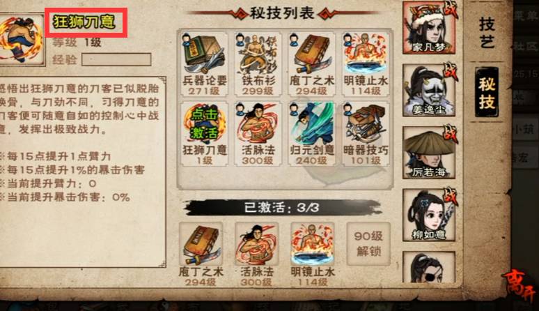 2.去万那里打听梦里的白虎,得到月下虎啸图,打开背包,看三遍月下虎啸图。可以在秘技里看到狂狮刀的含义。