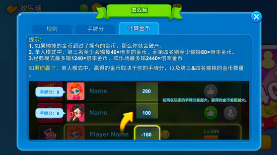规则二:【单人模式下,第三名至少损失40*金币,第四名至少损失60*金币;如果你赢了,赢得的金币不仅取决于你的手点数,还取决于第三名或第四名输掉的金币数量]