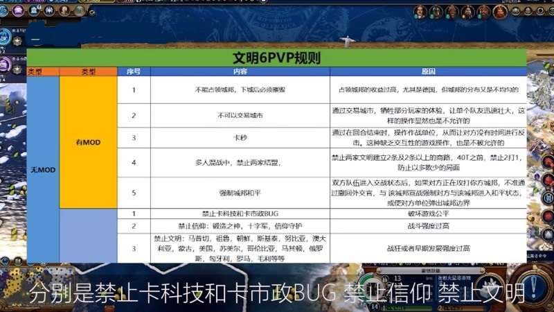 1.在MOD-free模式下,文明6实行三个禁止规则,即禁止卡牌技术和市政bug,禁止信仰,禁止文明;