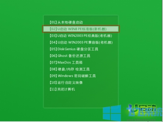 1.开机按U盘启动选择键,然后进入到u启动主菜单页面,接着移动光标选择“【02】u启动WIN8 PE标准版(新机器)”,按回车键确认,如下图所示: