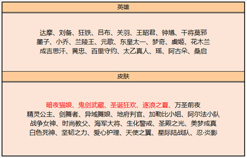 英雄:达摩、刘备、狂铁、昌布、关羽、王昭君、钟馗、干将莫邪、墨子、小乔、兰陵王、元歌、东皇太一、梦奇、虞姬、花木兰成、吉思汗、黄忠、百里守约、太乙真人、瑶、阿古朵、桑启