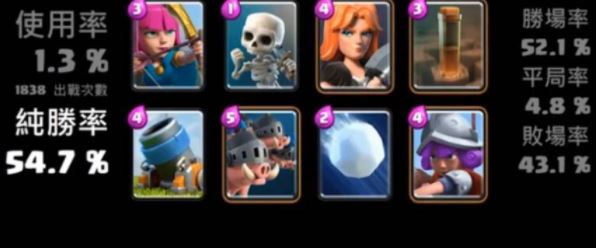 1.卡组分析:比较新的一套X弩卡组,虽然使用率并不比经典弩高,但是胜率相当高,达到53.0%。整个甲板防御能力强,同时成本很低,可以快速旋转,x光弩输出频率好。整个甲板的缺陷是防空能力。