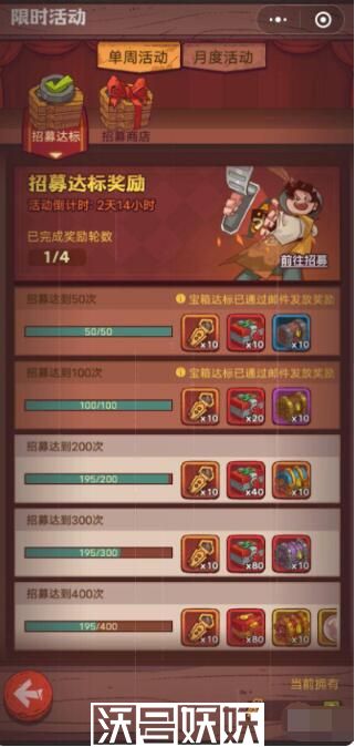 达到招募标准50次,可获得招募令*10、随机红色将军碎片*10、木质宝箱*10。