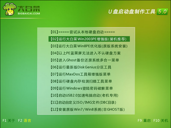 5、选择完成后,按回车键确认,即可进入大白菜主菜单界面。如下所示: